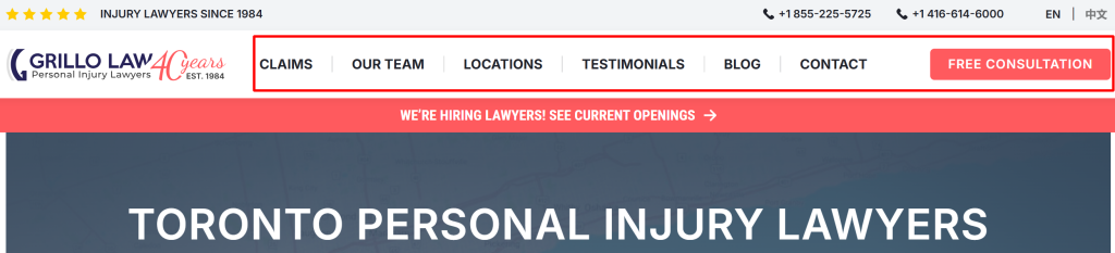 What Works: Grillo Law’s website succeeds by blending trust, accessibility, and conversion-focused design into a cohesive experience. It immediately establishes credibility through its legacy tagline, “Injury Lawyers Since 1984,” and transparent case results, while client reassurance comes from bold, repeated promises like “No fees unless we win.” Navigation is simple and client-first, with clear practice area explanations, a quick intake form at the top of the page, and multiple office locations across Ontario to emphasize reach. Social proof is woven throughout via strong Google ratings and authentic client testimonials, while authority is reinforced by showcasing the firm’s extensive team and network of medical and forensic experts. Altogether, the site balances authority with empathy, ensuring visitors quickly understand what the firm does, why it can be trusted, and how to engage.